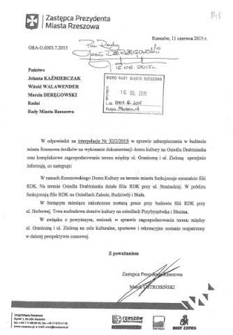 26 maja 2015 roku zwróciłem się z prośbą o zabezpieczenie środków w budżecie Miasta Rzeszowa na wykonanie dokumentacji dla Domu Kultury oraz kompleksowego zagospodarowania tego terenu (ul. Graniczna, ul. Zielona), uwzględniając wykonanie boisk sportowych oraz terenów rekreacyjnych dla mieszkańców, w tym dzieci. Ze względu na prace przy budowie filii RDK przy ul. Herbowej oraz rozbudowę domów kultury na Osiedlach Przybyszówka i Słocina, rozpatrzenie mojego wniosku zostało niestety odłożone na późniejszy termin.