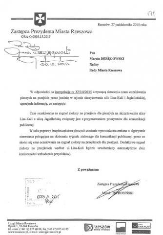 13 października 2015 roku, w imieniu mieszkańców oraz pieszych, którzy codziennie przekraczają przejście w okolicach ul. Jagiellońskiej i Lisa-Kuli, zwróciłem się z prośbą do Prezydenta o regulację świateł celem sprawnego i szybkiego ruchu pieszych. Od czasu wprowadzenia systemu inteligentnego zarządzania transportem publicznym czas oczekiwania na zielone światło znacznie się wydłużył, co wpływa na duże zdenerwowanie pieszych oraz przekraczanie przejścia na czerwonym świetle. W odpowiedzi otrzymałem zapewnienie o wprowadzeniu zmiany w algorytmie sterowania i skróceniu czasu oczekiwania na sygnał zielony na przejściach dla pieszych. Sygnał zielony wzdłuż ul. Lisa-Kuli ma też być uruchamiany automatycznie.